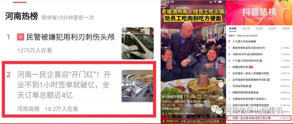 年度关键词:社会责任 河南矿山在保持高质量发展的同时,积极参与各类社会公益,为共同富裕做贡献。今年7月份,郑州、新乡遭遇水灾,公司在自身遭遇严重水灾的情况下,仍然第*时间捐款捐物250万元;8月份,公司开展了第十八届捐资助学活动,捐助资金110余万元,资助210人;9月份,在第三十七个教师节暨表彰大会上,公司党委书记崔培军向魏庄街道教育系统捐资50万元。这一系列大爱善举,体现了公司践行社会责任与担当,彰显了公司热心公益、心系社会的初心和使命。 年度关键词:孝文化 3月份,公司启动了第十届孝亲感恩旅游节,1000余名员工父母乘坐豪华大巴,奔赴江西庐山、井冈山等红色胜地,开启了为期6天的红色文化旅游之旅;9月份,公司启动了金秋送福活动。12个送福小组,29台送福车辆,连续4天分批次将中秋福利送至1900余名业务经理家中;10月份,*二届孝文化美食节在公司智能产业园欢乐启动,全体员工一连三天免费吃烧烤,看演出;12月份,公司4500名员工分批次欢聚公司多功能厅,免费参加火锅盛宴。 年度关键词:重大项目 4月份,公司承制的宝钢湛江钢铁1550冷轧项目起重机、中冶京诚晋钢冷轧工程项目起重机、宝钢德盛高炉主体EP项目抓斗桥式起重机设备顺利通过专家A检;6月份,公司72米大跨度起重机成功助力简州大桥建设;9月份,公司承制了一批大跨度、精度高、低能耗新型绿色化起重机产品,为我国风电清洁能源产业的发展提供技术和装备支撑;11月份,公司为金汇集团绿色智能升级项目承制的2台(套)200吨四梁铸造桥式起重机,为江苏申港制造基地承制的400/100吨新型双梁起重机交付使用,标志着公司研发生产的高端、绿色、低碳起重机产品得到市场承认;12月份,公司为中国航天科技集团承制的160t+160t新型防爆双梁桥式起重机,顺利通过载荷试验,标志着公司承制的大吨位防爆桥式起重机在航天领域“零的”;为太仓港承制的2台轨道式集装箱门式起重机顺利交付,成为今年以来继中国铁路、中铁一局、东方红(*际)陆港、锦州港、贵绳集团等重大项目后,河南矿山又一集装箱门机*品力作。 年度关键词:战略合作 5月份,河南矿山与SEW达成战略合作,双方聚焦钢铁冶金、煤炭矿业、港口建设、建筑建材等各大工业领域,在冶金铸造吊、大型桥机、军工以及新型起重机等方面,进行深入合作;公司与南高齿结成长期战略合作伙伴,双方在起重机产业发展、产业链供应链稳定、战略合作等有关方面达成了高度共识;12月份,公司与安钢集团签订战略合作签约仪式,在转型升级、市场开拓等方面展开深度合作。 年度关键词:行业盛会 2月份,河南矿山主办的*二届起重机发展高峰论坛在公司多功能厅举行,本届论坛主题是“市场拓展寻机遇、产品创新赢未来”。作为起重装备制造业的高质量专注性论坛,已成为业界权威性的交流合作平台;4月份,公司承办的第七届中国•长垣*际起重装备博览交易会在长垣*际会展中心举行。河南矿山当天签约17亿元,创供销交易额新高。 年度关键词:员工福利 2月份,公司举行了2020年度工作总结暨表彰大会,表彰了2020年度先进个人86人,先进集体20个,同时对被评为2020年度矿山孝星的18位员工发放精美礼品;3月份,公司在智能产业园举行了三八红旗手表彰大会暨文艺联欢会,为1590名女员工每人发放了800元礼金和节日礼品;在奖励*秀班组长授车仪式上,公司拿出420万元奖金,奖励24名一线*秀员工每人一辆纯电动比亚迪全新秦EV;5月份,公司举行三夏生产动员暨表彰大会,为每位员工发放1000元现金及大礼包;12月份,公司开设海南培训学习班,分批次为员工提供为期15天的知识技能培训。 年度关键词:书香矿山 6月1日—3日,公司党委书记崔培军连续三天,亲自为广大员工赠送书籍,营造了书香矿山的浓厚氛围;10月份,公司举办了*批拜师仪式,是河南矿山实施人才战略,推进公司从强到精战略转型的具体体现;公司开设了为期9天的技能提升培训班,通过理论加实操的方式,提高全体员工的生产技能和整体素质,掀起了第四季度质量提升新高潮。 年度关键词:党建引* 6月份,公司党委主办了“学党史、懂厂史,献礼建党100 周年”知识竞赛,是河南矿山学党史、感党恩,庆祝建党100周年系列活动之一;7月份,在庆祝建党100周年暨“两优一先”表彰大会上,公司11名党员获评“*秀共产党员”荣誉称号;8月份,公司党委宣传部自编自导的微电影《初心永恒—先进人物管建春》,荣获“新乡市庆祝建党100周年初心永恒微视频二等奖”;10月份,河南省“小个专”党建先进典型巡回宣讲活动在新乡举行,公司党委副书记张如志受邀参加活动并作党建经验宣讲;11月份,公司党委、工会共同组织了第*届“我和我的矿山”主题演讲比赛;12月份,公司党委组织了“我爱我的矿山”手机摄影大赛,得到了全体员工的踊跃参加,进一步丰富了员工文化生活,增强了员工“爱国爱家爱矿山、感恩立德我先行”的感恩意识。 年度关键词:媒体宣传 2月份,央视等数十家媒体聚焦河南矿山开门红:*日订单3.52亿元;公司年度表彰大会频上微博热搜、抖音热榜等各类媒体头条;公司第十八届捐资助学、防汛救灾等公益事业及孝文化系列活动,被央视、省市级媒体聚焦报道,公司社会美誉度再度大幅提升。 年度关键词:行业荣誉 今年以来,公司相继荣获中国工业创新标杆企业、中国重型机械行业“十三五”科技创